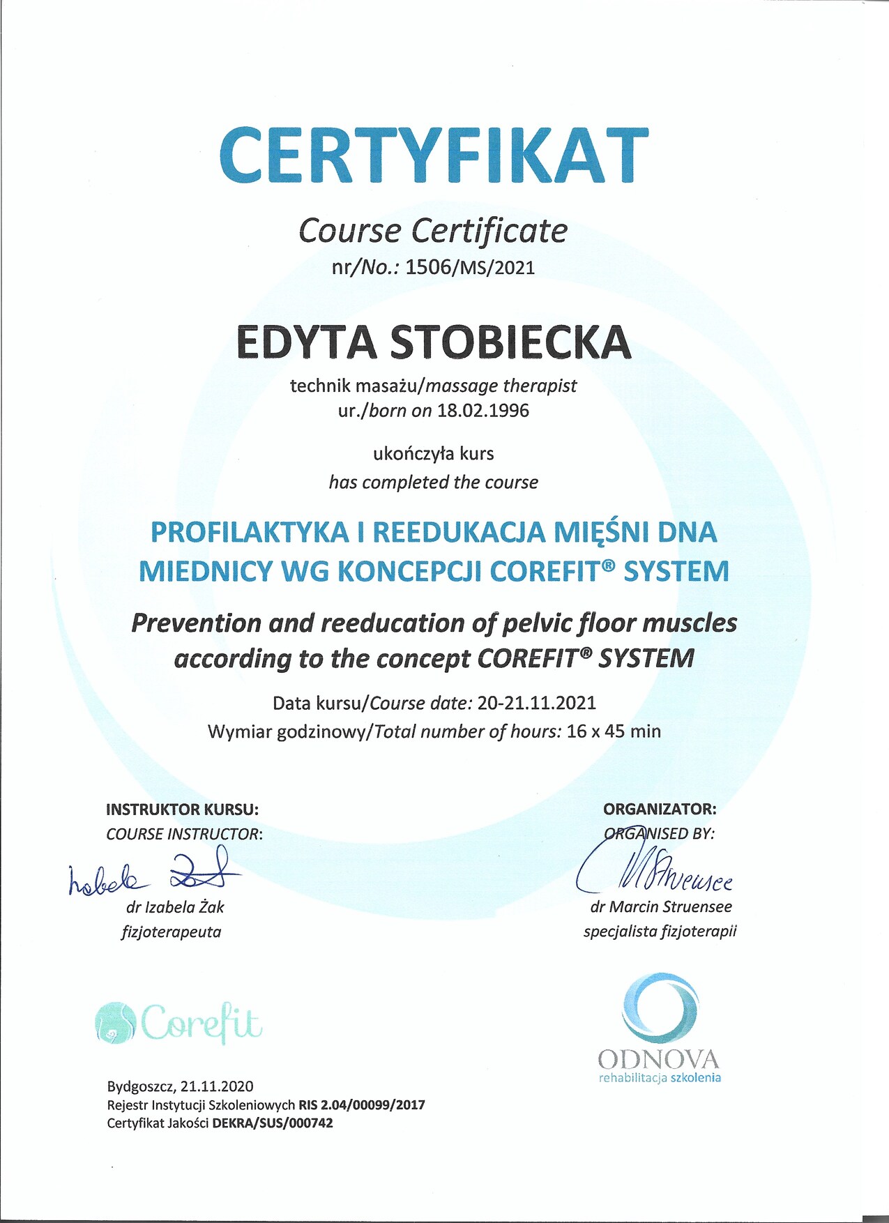 Jestem dyplomowanym technikiem masażystą oraz terapeutą uroginekologicznym z pasją do pomagania innym. Moja praktyka opiera się na solidnych fundamentach wiedzy i doświadczenia, które stale poszerzam poprzez regularne uczestnictwo w szkoleniach.